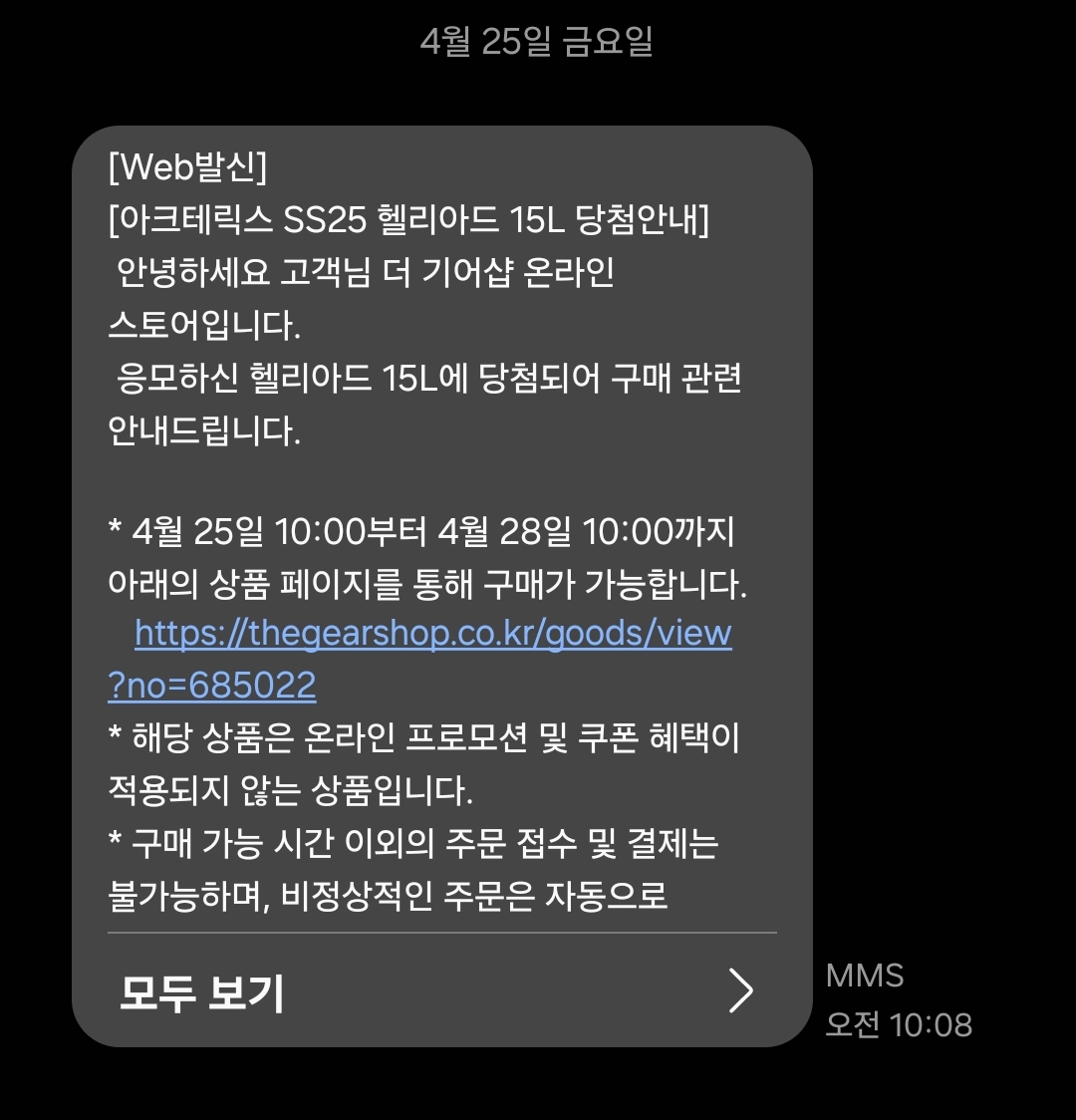 실제 더기어샵에서 받은 당첨 문자도 함께 첨부합니다.